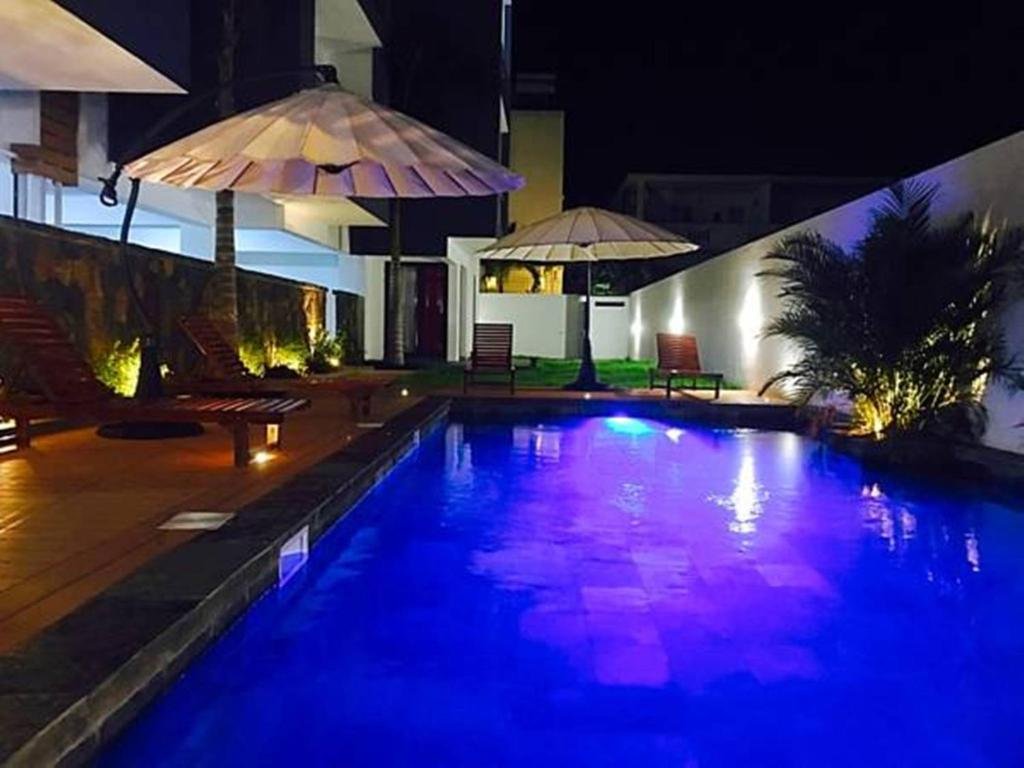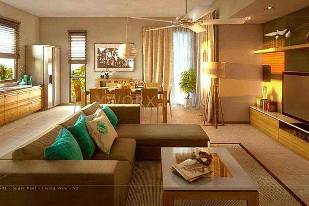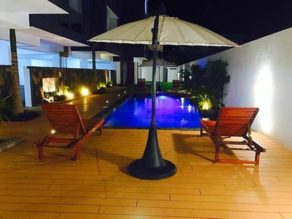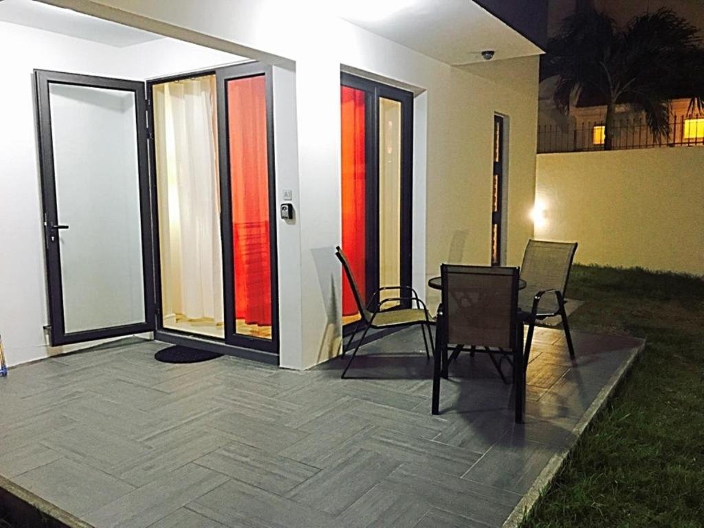 This modern two-bedroom apartment features a large balcony/terrace in a private garden area overlooking the pool. It includes a fully equipped kitchen and a living room area with a sofa bed.