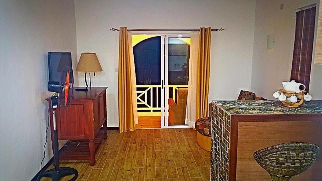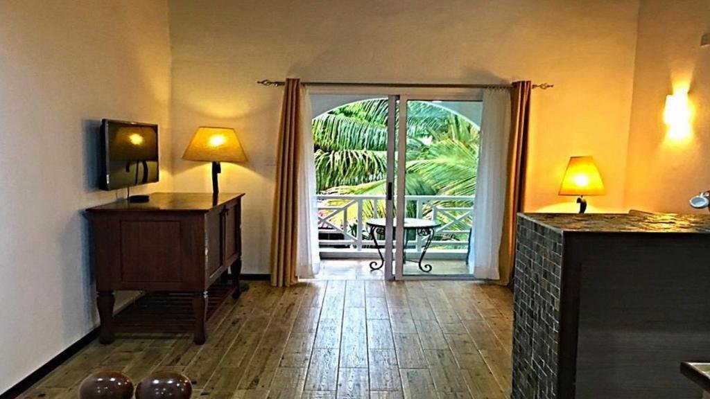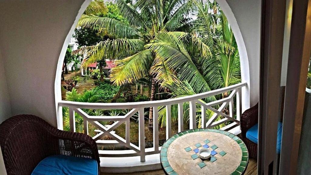 This second-floor bungalow features a bedroom with a balcony offering partial sea views. The modern bathroom is equipped with a shower. The living area has a sofa bed and a separate balcony overlooking the garden.