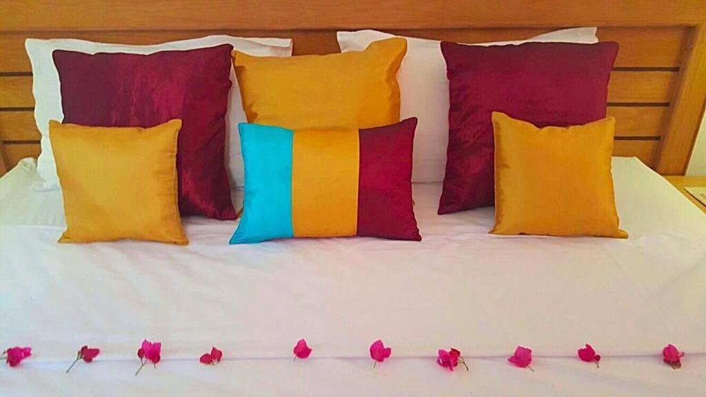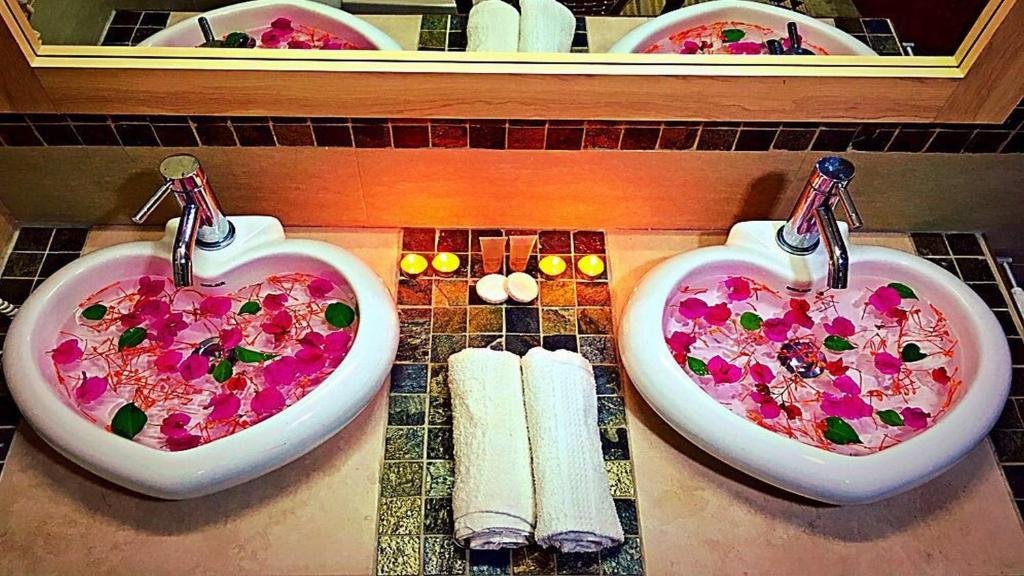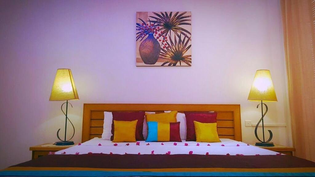 This bungalow has a separate bedroom and a modern bathroom with a double vanity and a shower-over-bath combo. The unit has a well-equipped kitchen and a living area overlooking the tropical garden.