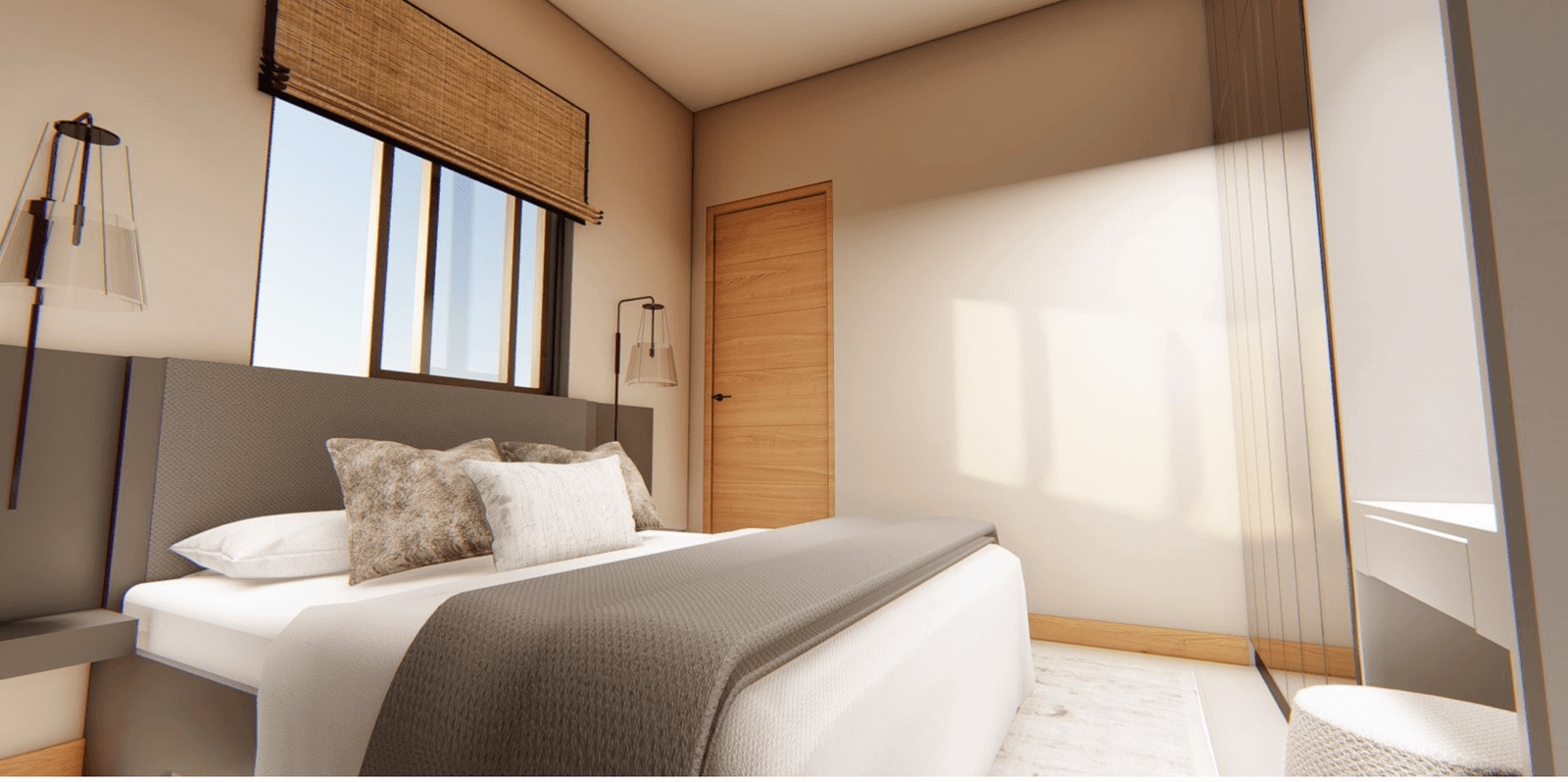The unit has three bedroom and a bathroom with a walk-in shower.