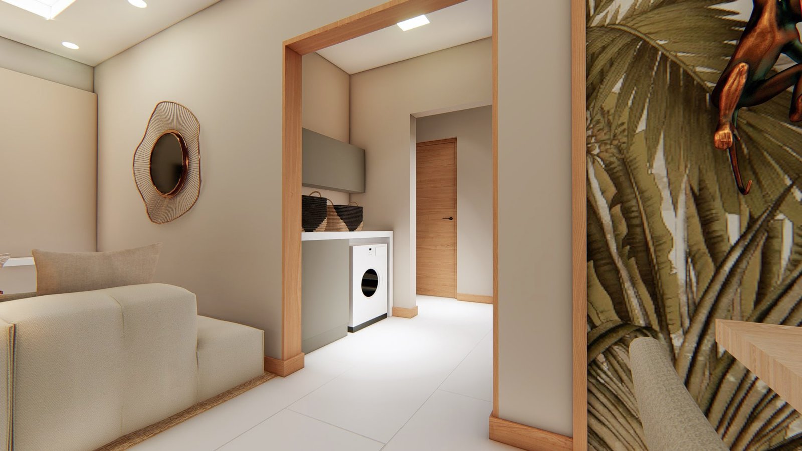 It includes a fully equipped kitchen and a living room area with a sofa bed.