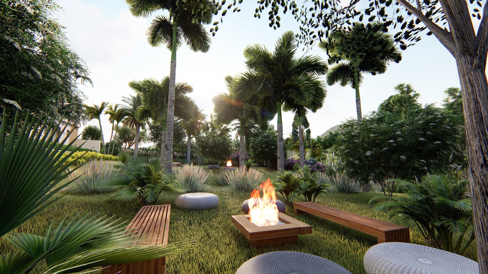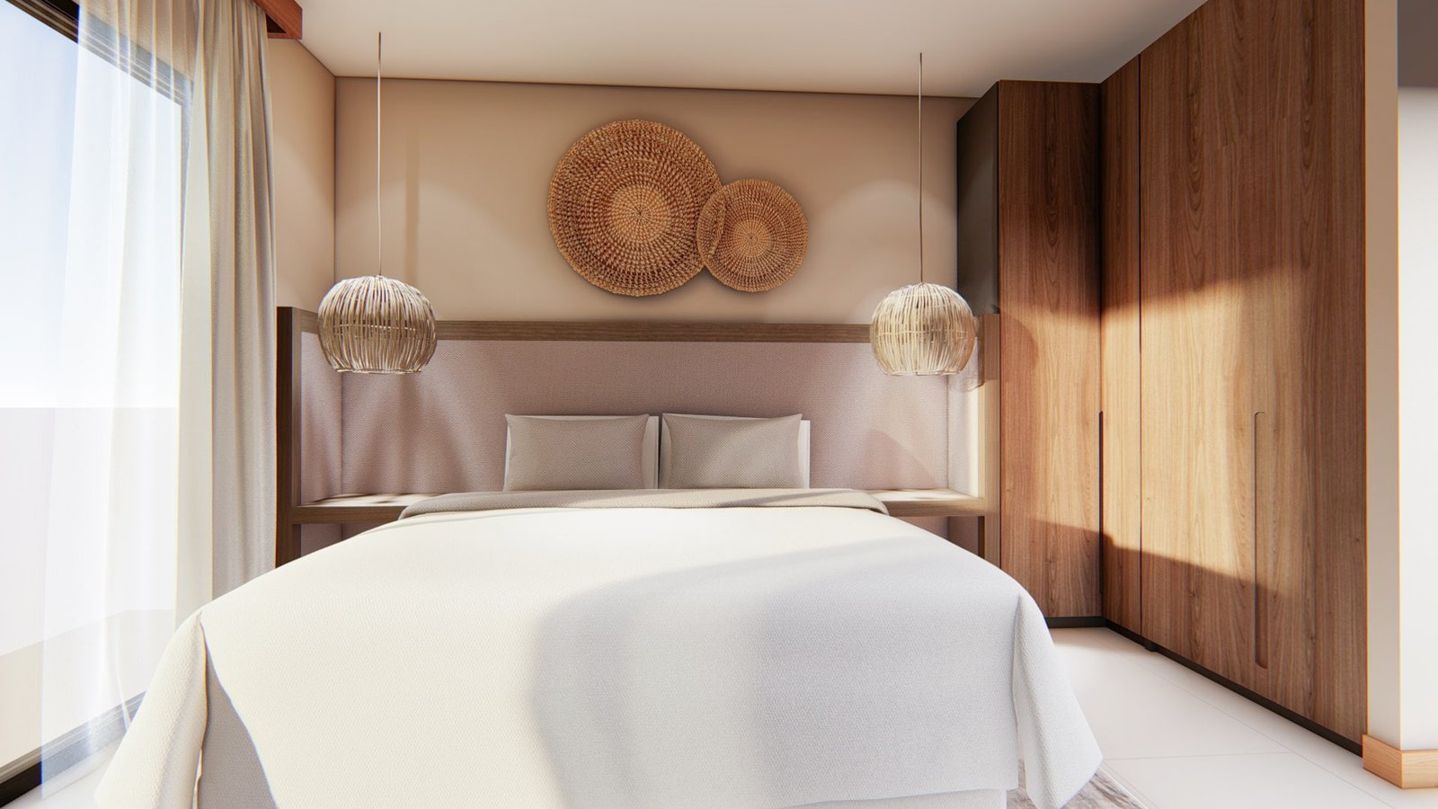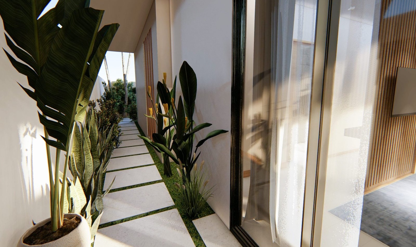 This modern three-bedroom apartment features a large balcony/terrace in a private garden area overlooking the pool.