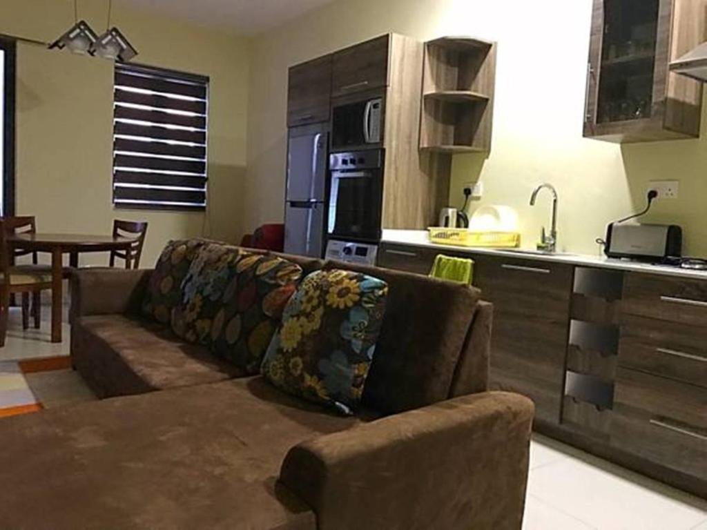 This modern apartment features a large living room with a wooden dinning table. Its features a kitchen and a balcony overlooking the pool and the mountains.