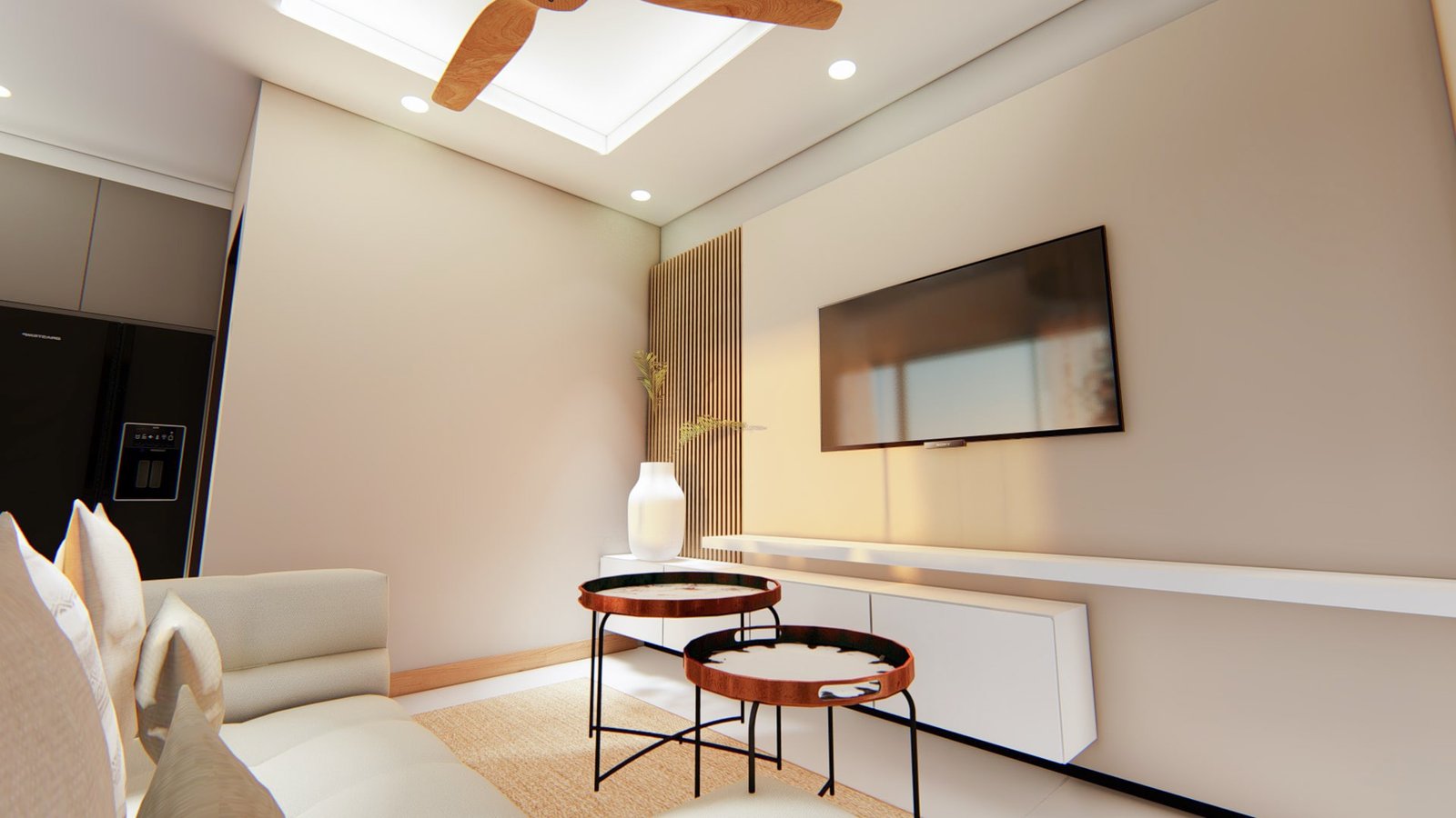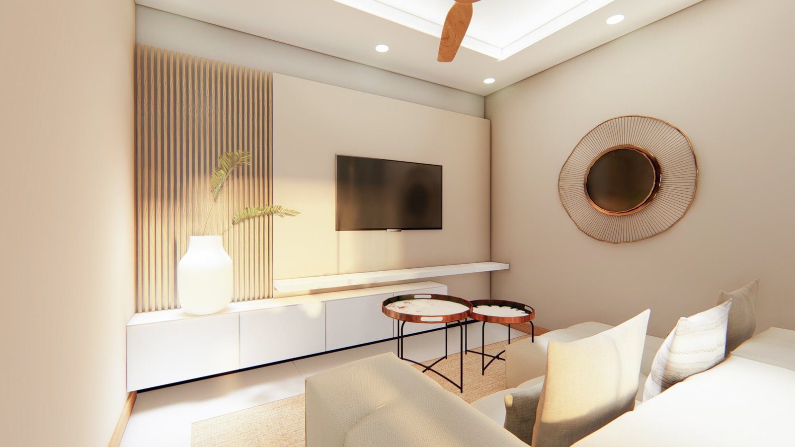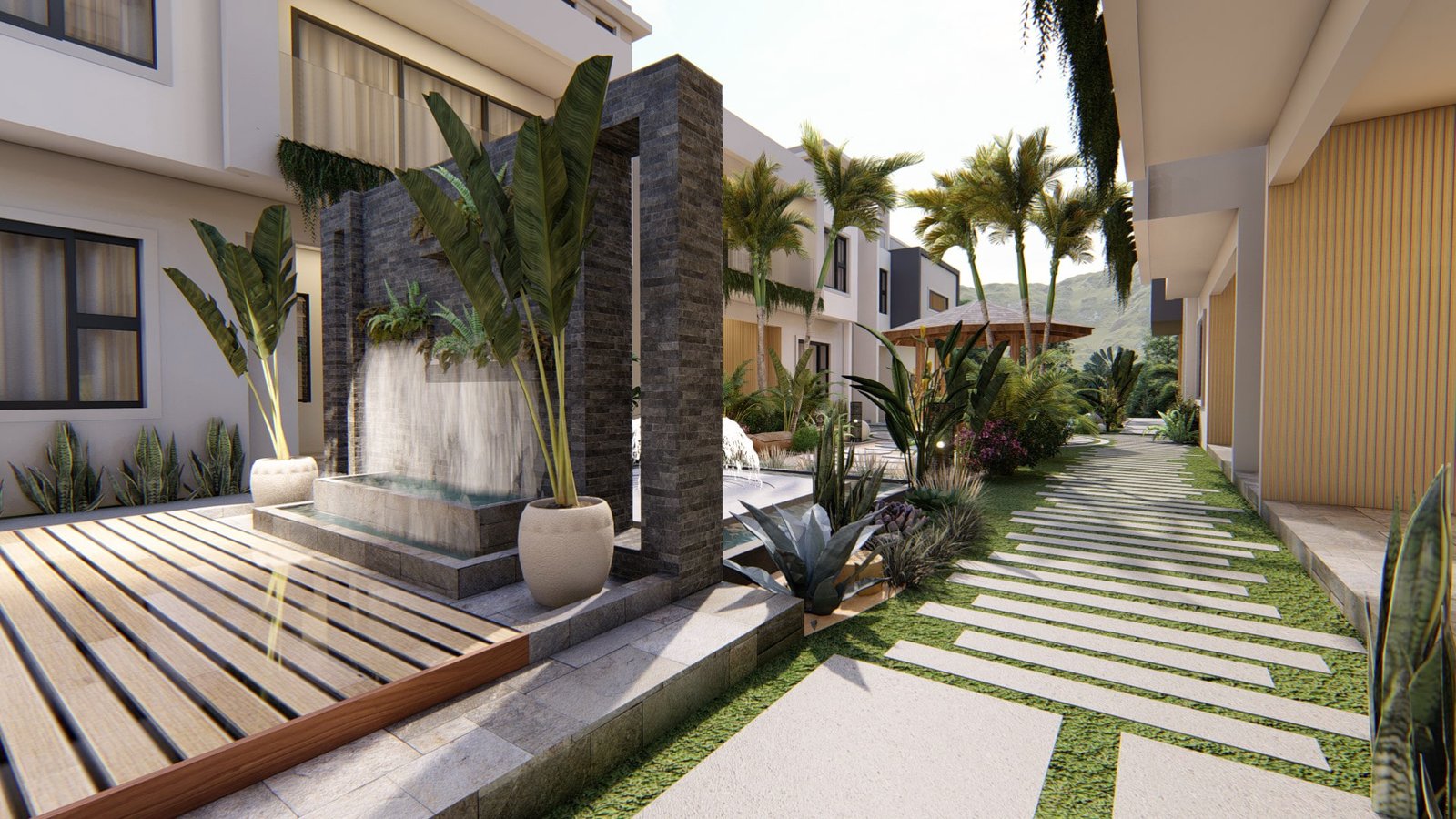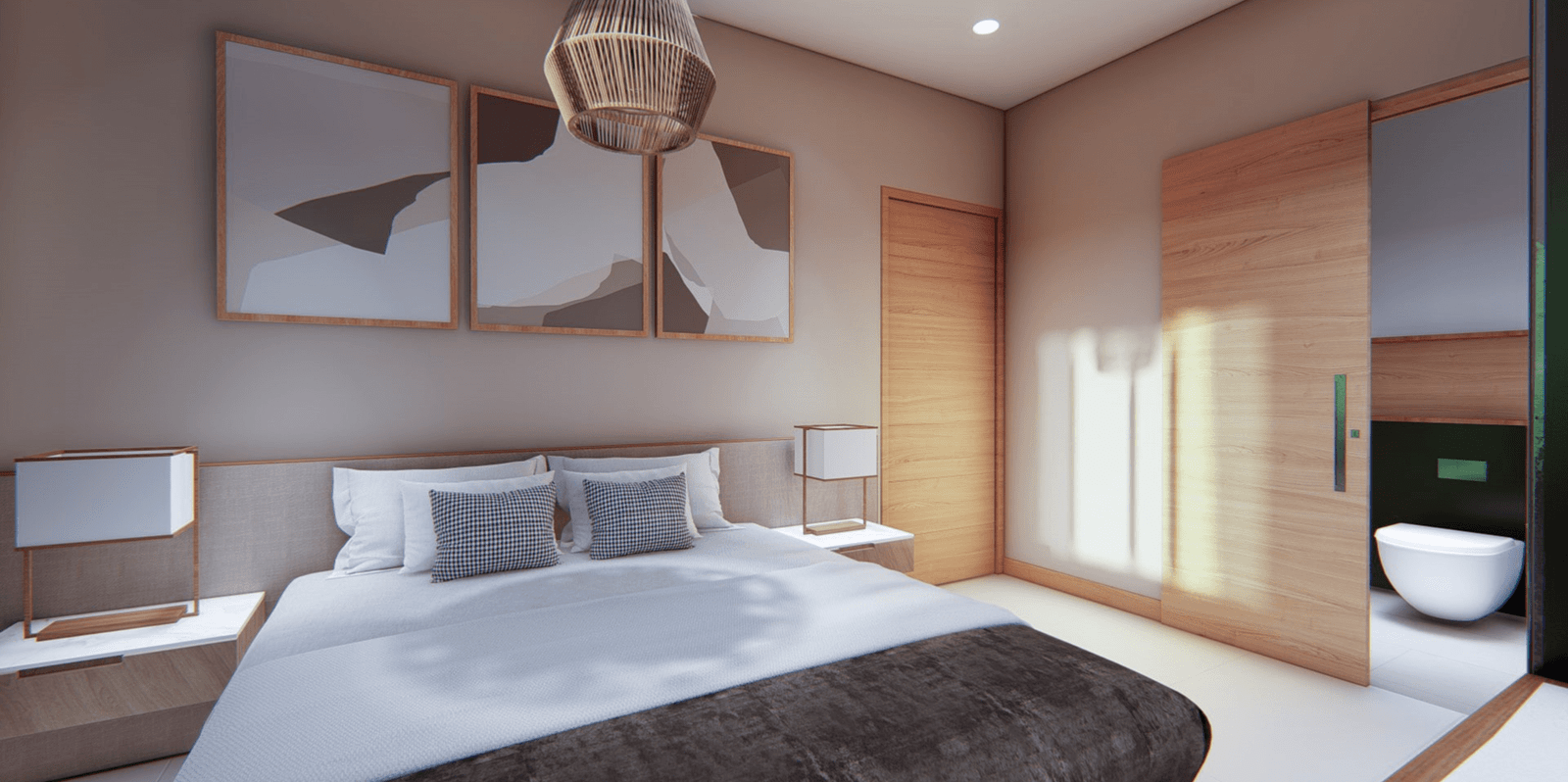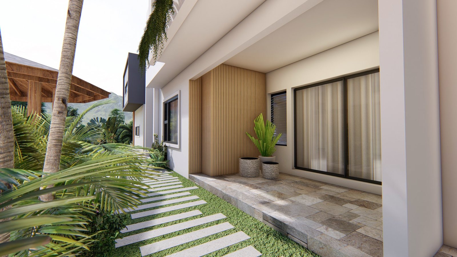 This modern two-bedroom apartment features a large balcony/terrace in a private garden area overlooking the pool.