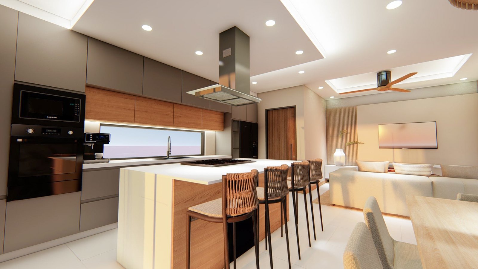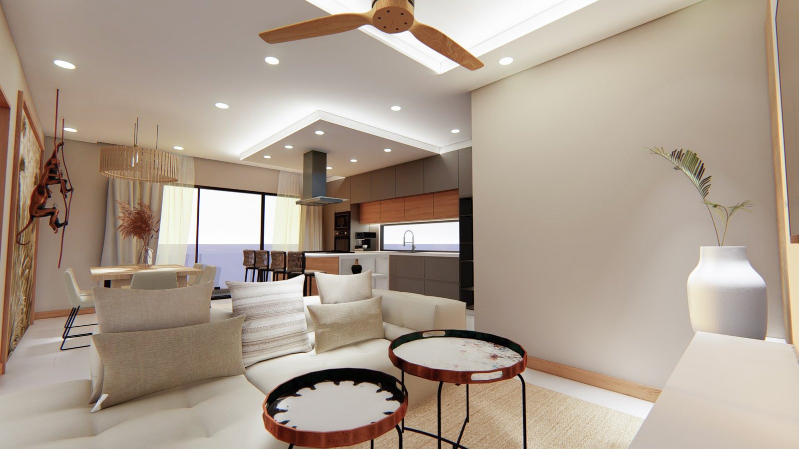 It includes a fully equipped kitchen and a living room area with a sofa bed.